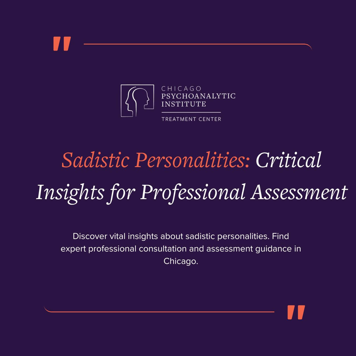 Don’t face the challenges of assessing sadistic personalities without professional support. Contact our Chicago treatment center to learn more about specialized consultation services for professionals working with these complex presentations. Schedule your consultation and gain valuable insights for appropriate assessment, risk evaluation, and institutional management.