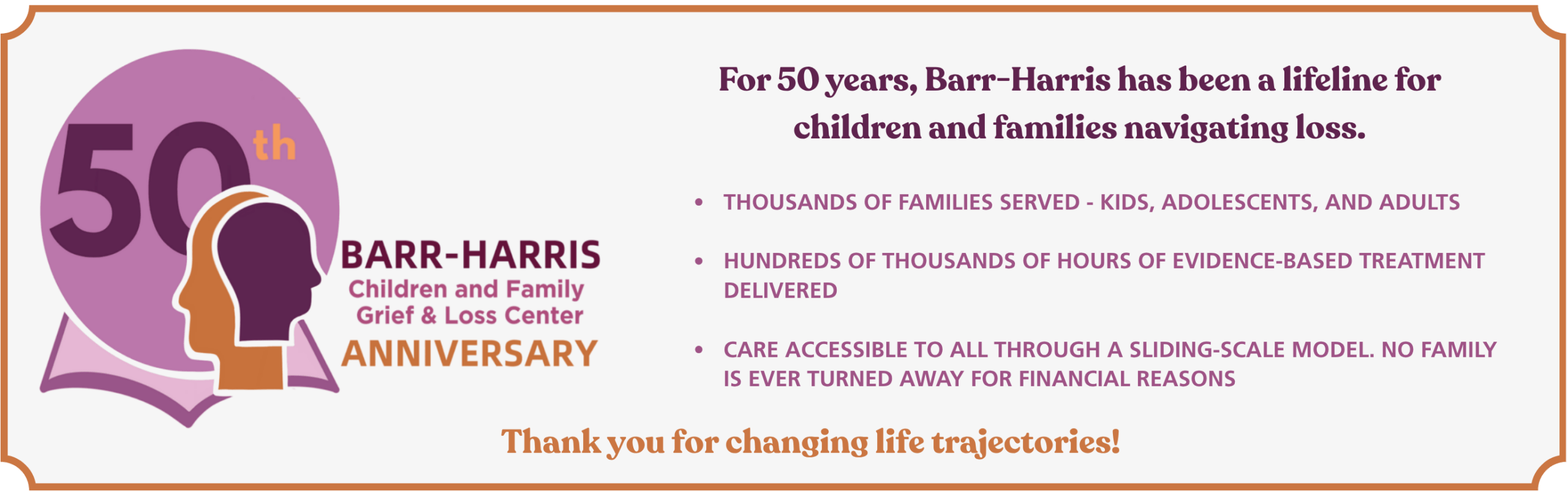 You’re not just celebrating 50 years. You’re building the next 50 with more trained therapists, more Barr-Harris programs in schools and communities, and new crisis-response capabilities. Thank you!